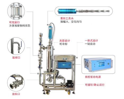 The ultrasonic dispersion pilot circulating testing machine can also be called industrial ultrasonic disperser. It consists of ultrasonic host, numerical control driving power supply, circulating reactor and peristaltic pump. In addition, temperature detection, pressure detection and solid-liquid mixing feeder are optional. Usually, it is used to simulate the process of pipeline ultrasonic processing. This series combines all the handling, R&D and testing projects of ultrasonic liquid. The ultrasonic power ranges from 1000W to 3000W and the volume is more than 5L.